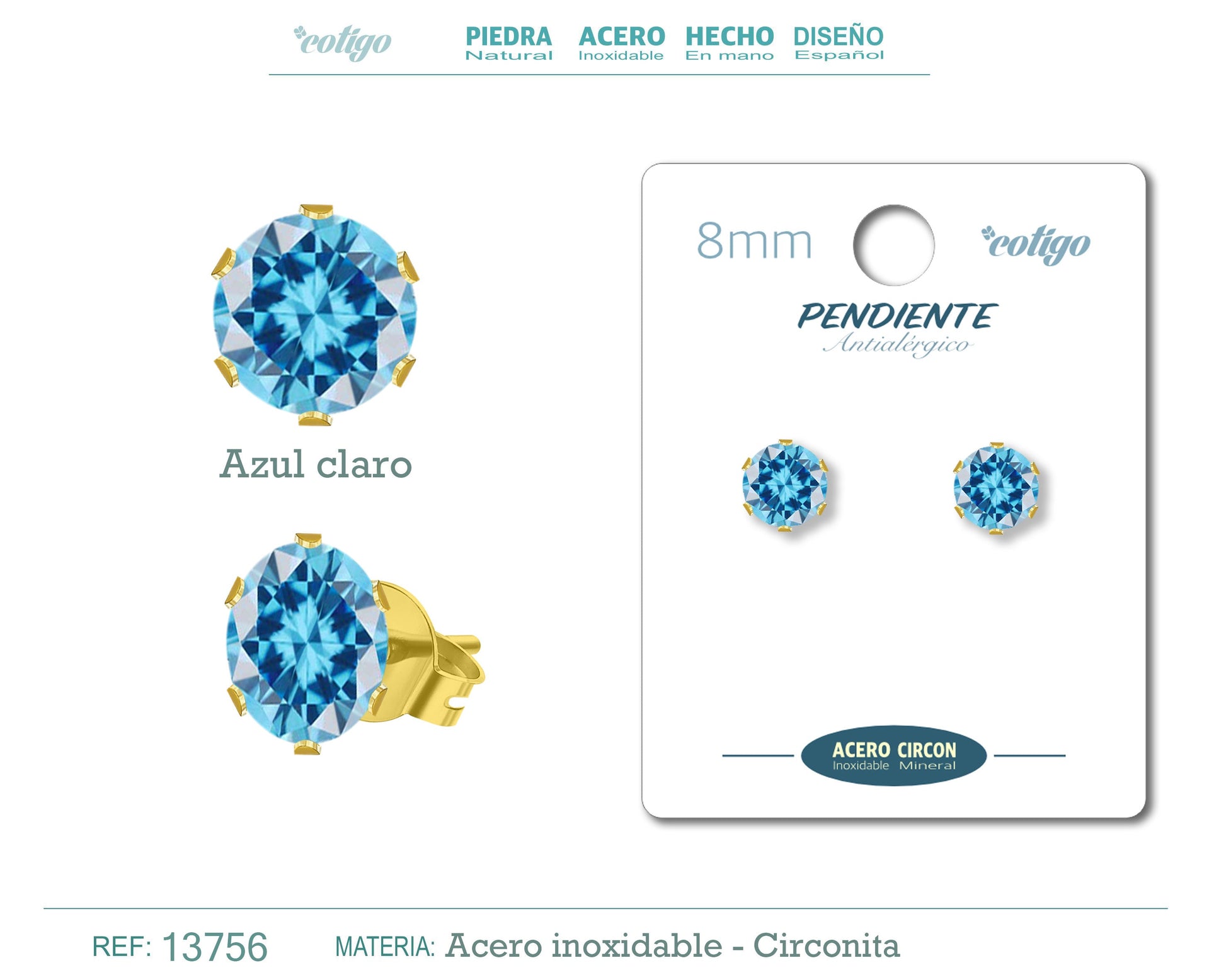 Pendiente Circonita Redondo-Azul claro-8mm-Base Acero Dorado