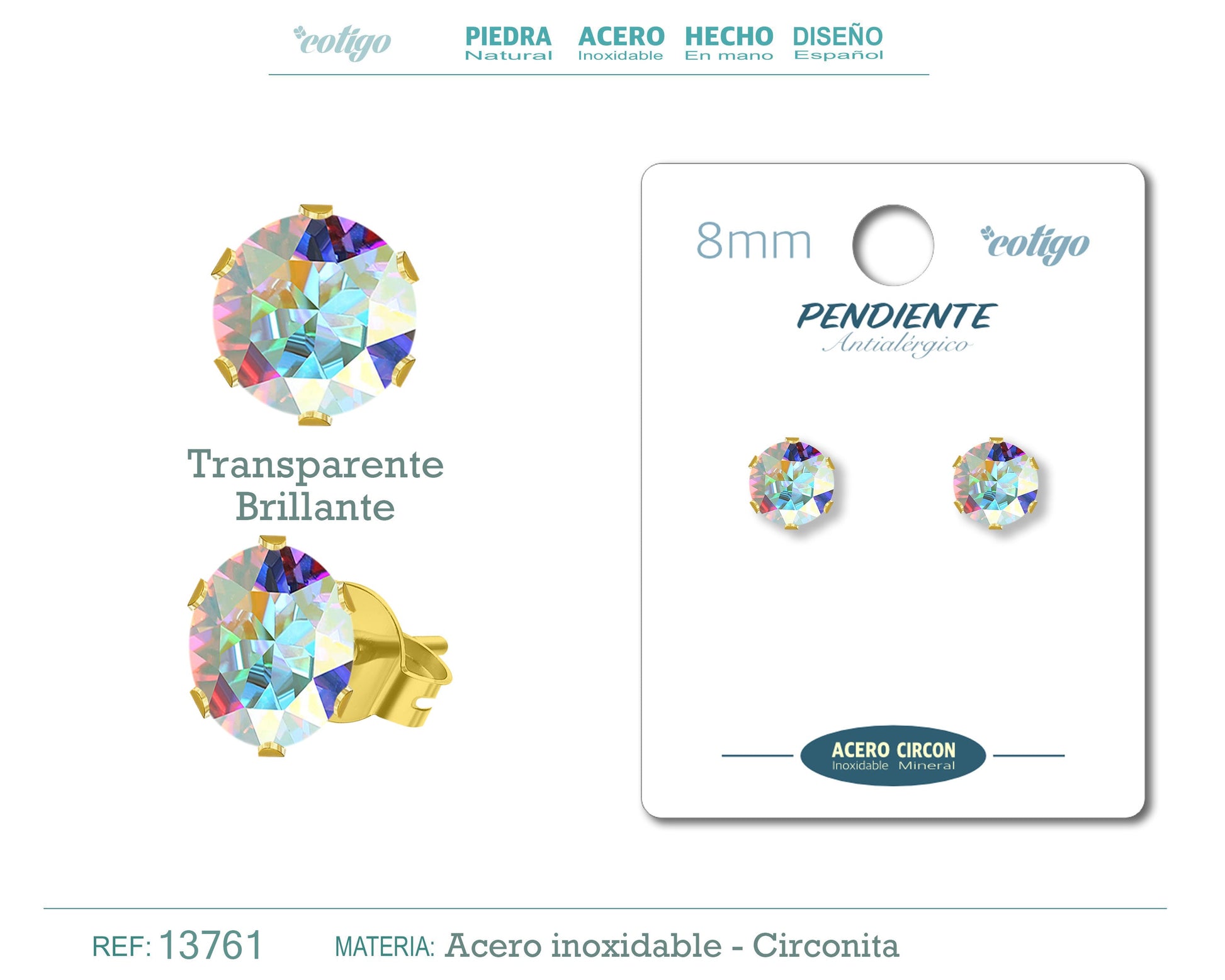 Pendiente Circonita Redondo-Transparente brillante-8mm-Base Acero Dorado