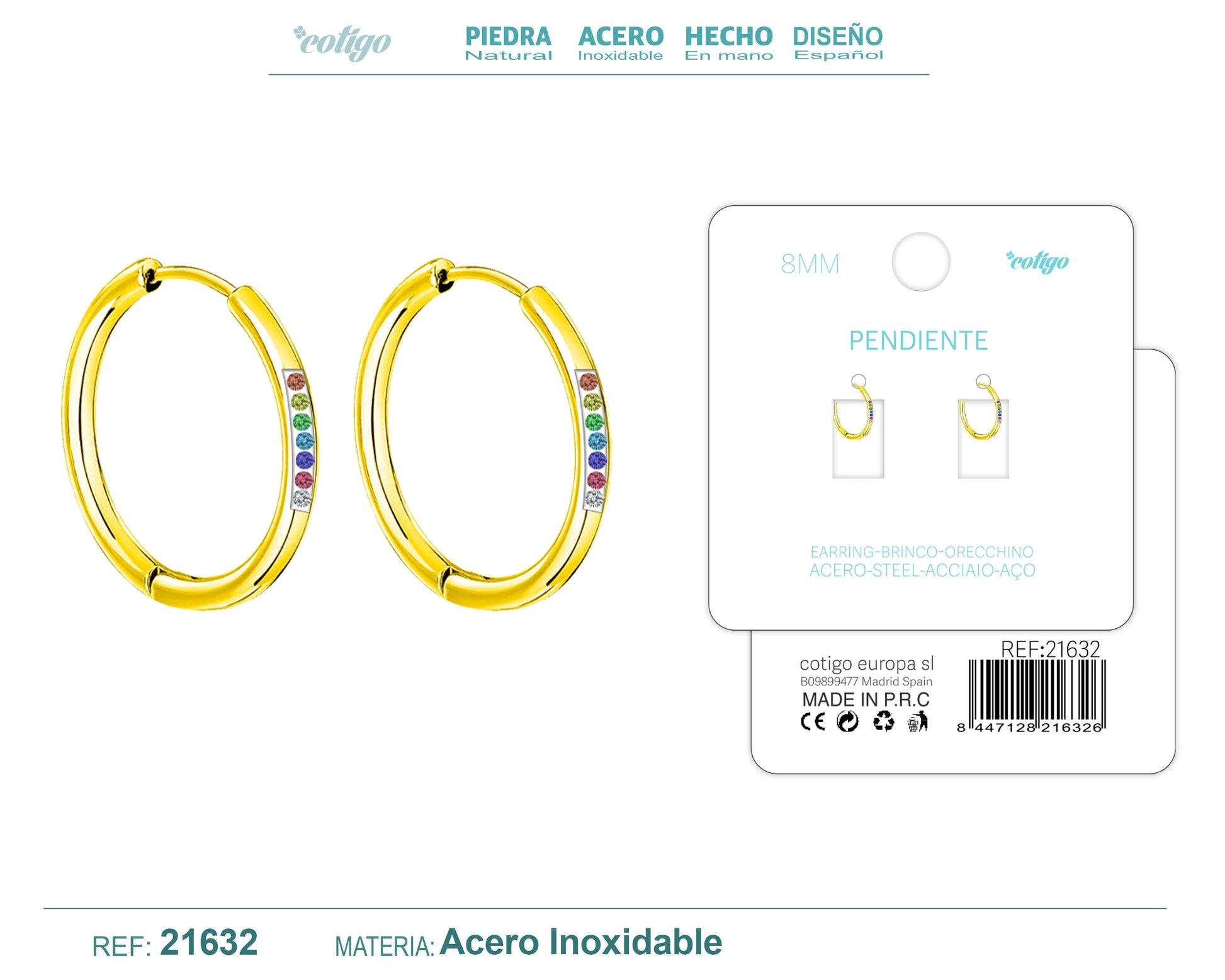 Aro acero 8mm Dorado con Circonita colores