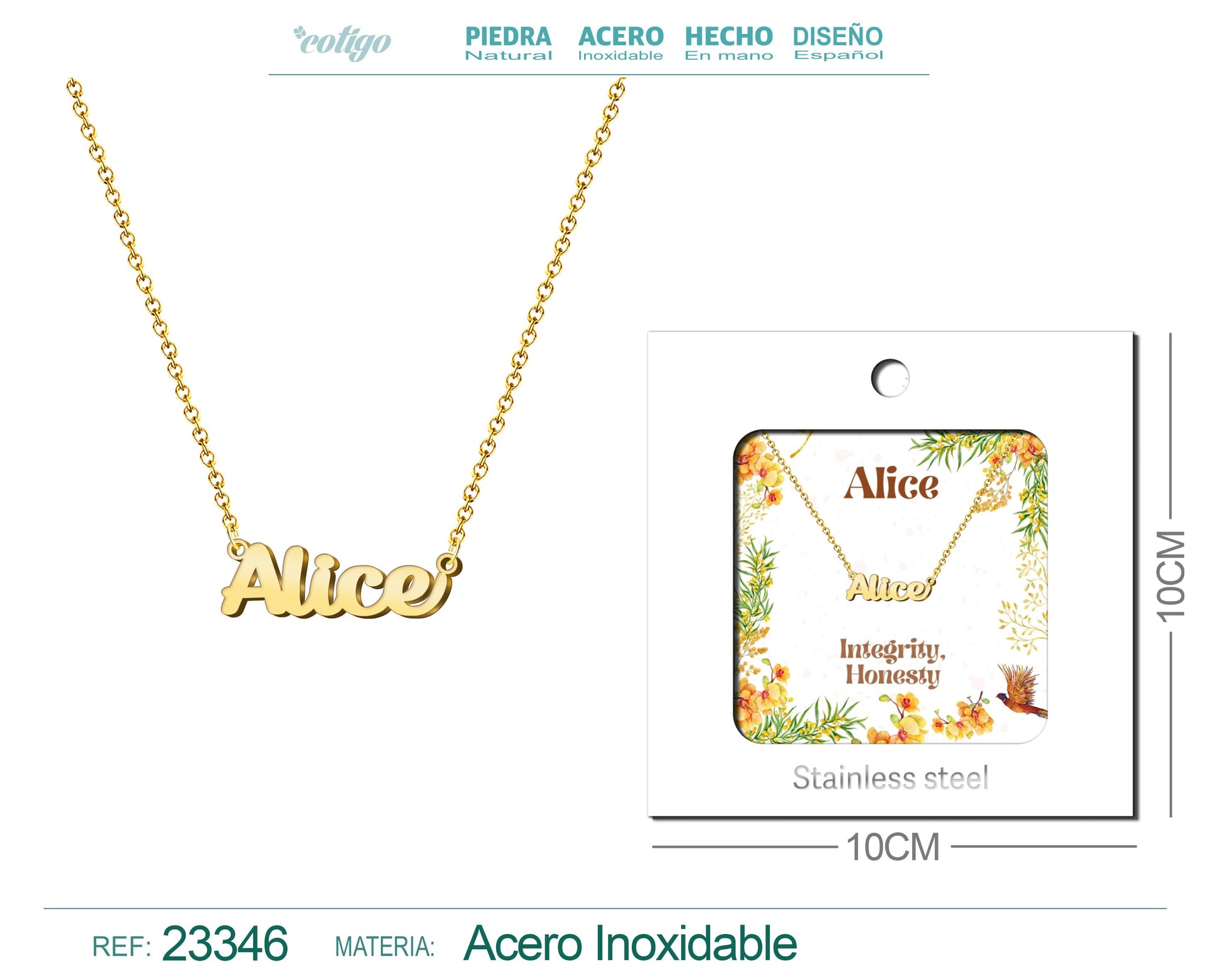 Collar Nombre Ingles Alice Acero con Sobre