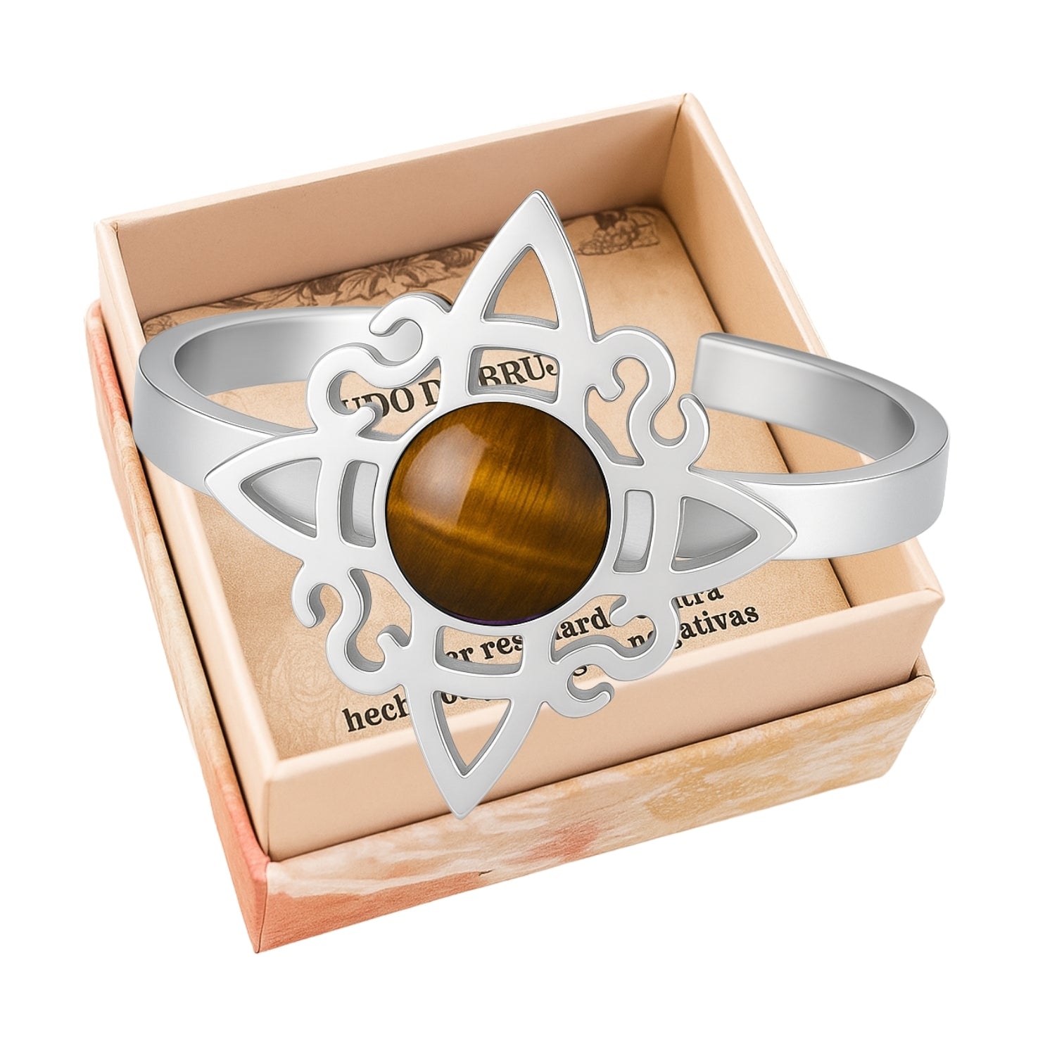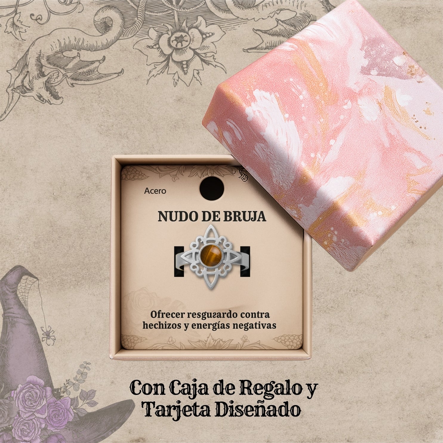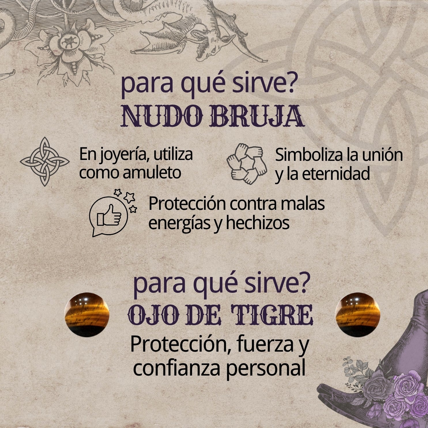 El ojo de tigre, conocido como la “piedra de la protección y la valentía”, aporta enfoque, determinación y protección contra la envidia y el mal de ojo. El Nudo de Bruja protege contra hechizos, envidias y energías negativas, simbolizando unión y eternidad.