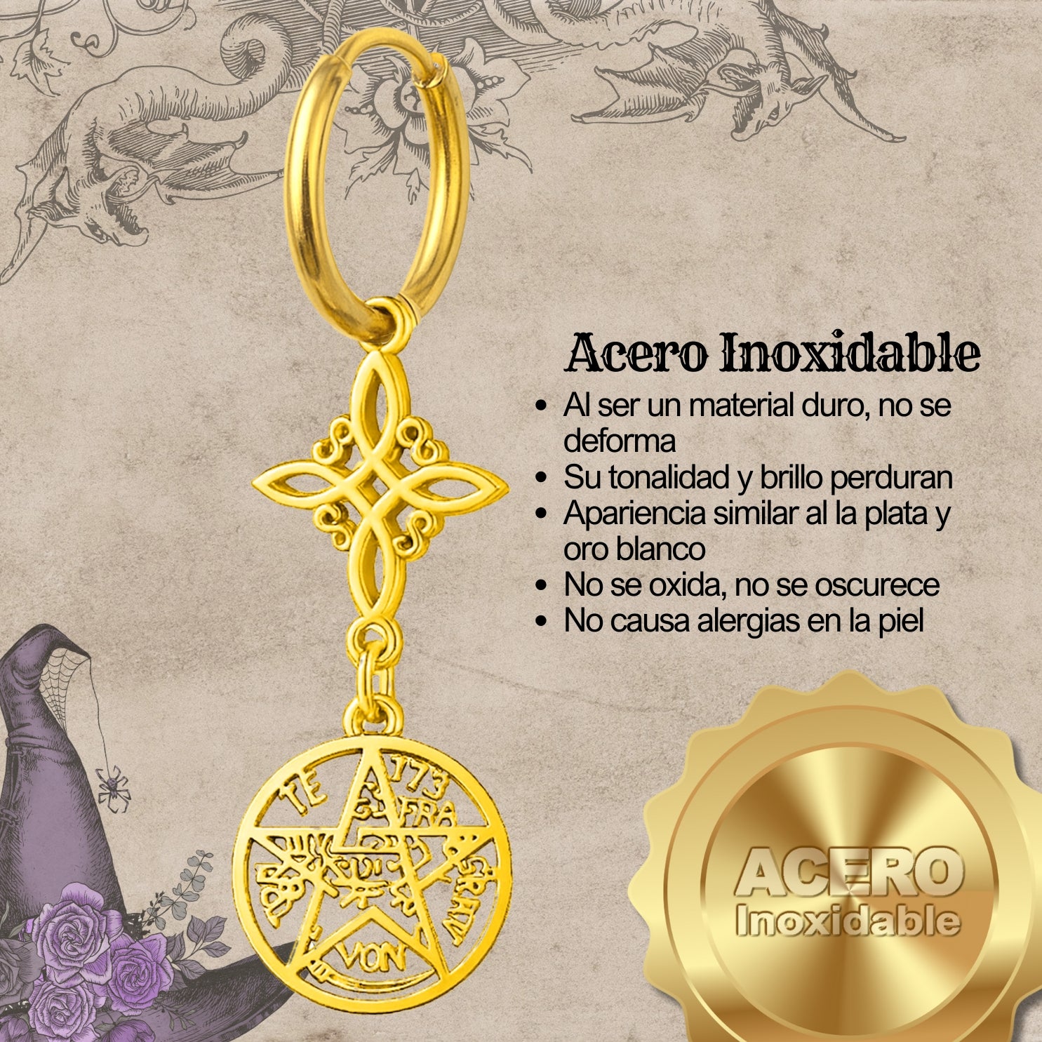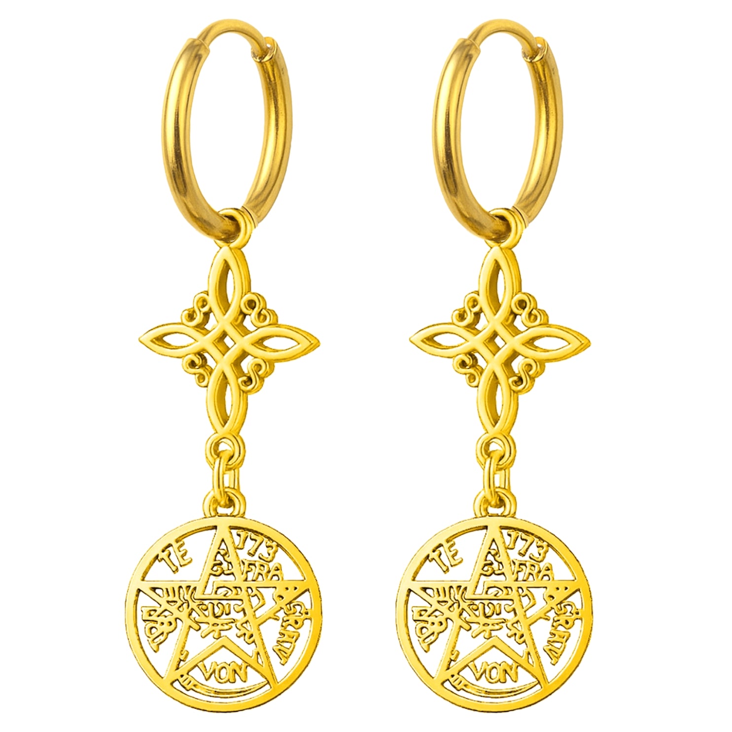 Pendientes Tetragramatón con Nudo de Bruja – Acero Inoxidable Dorado, Amuleto de Protección