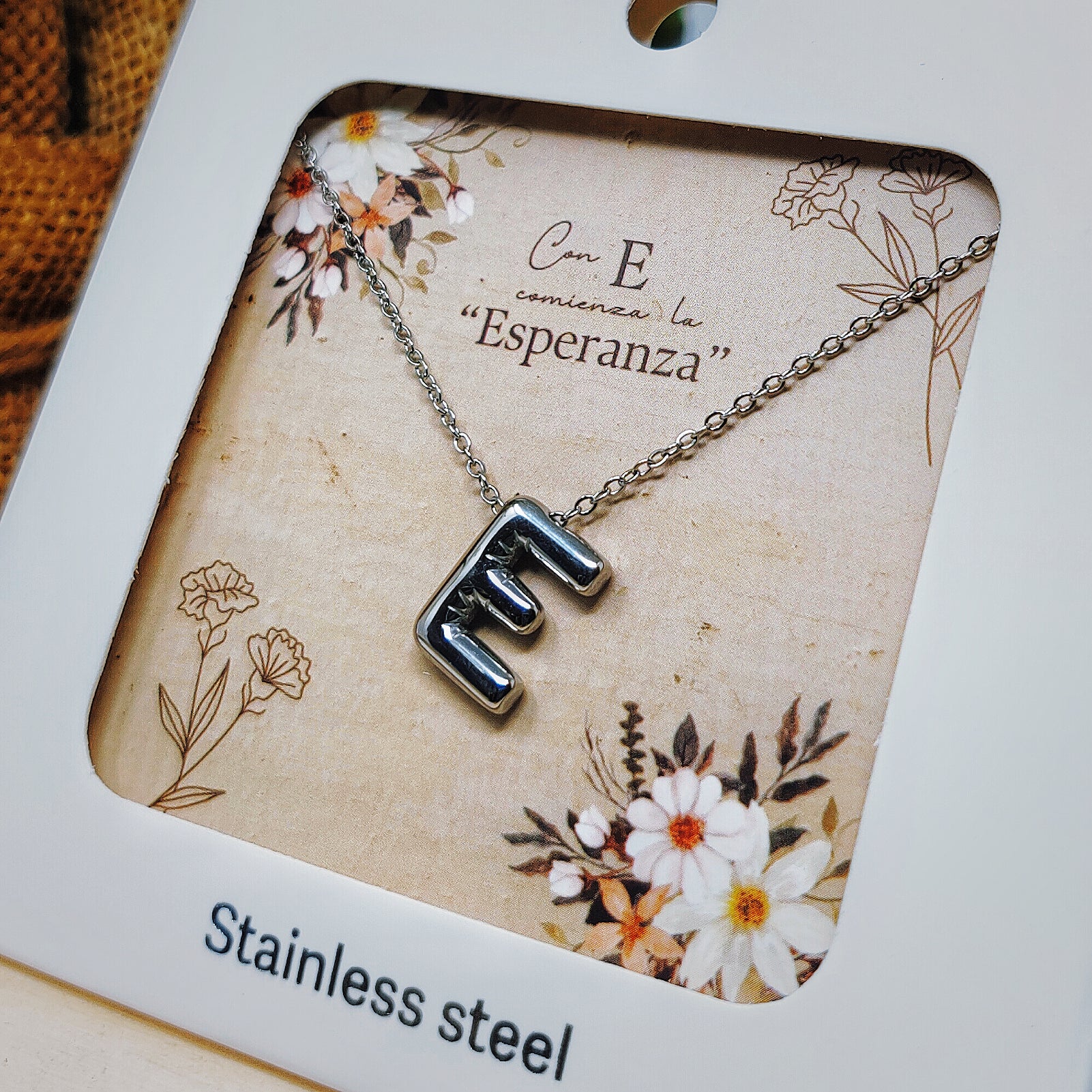 Minimalismo moderno: Collar Letra E en Acero Plateado