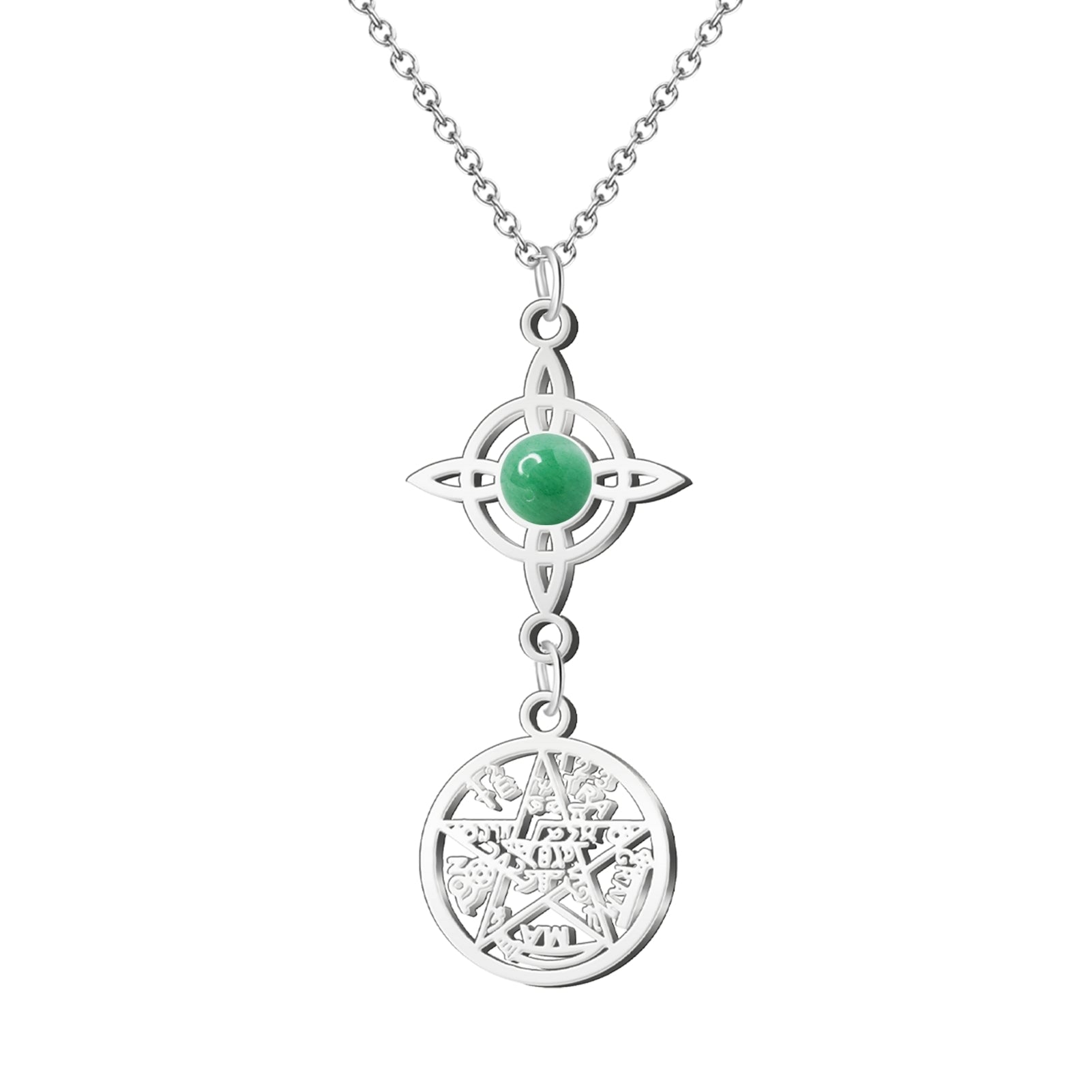 Colgante Tetragrammatón con Nudo de Bruja y Aventurina Verde – Suerte, Bienestar y Prosperidad en Acero Inoxidable