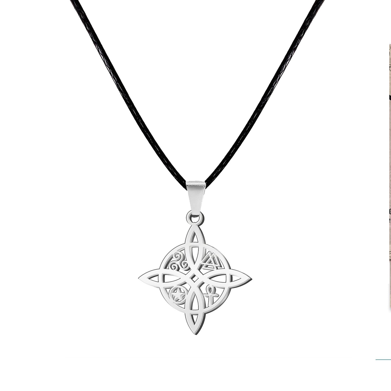 - ᯽ COLLAR NUDO DE BRUJA PLATEADO DE HILO ENCERADO: este nudo de bruja especial posee en su interior: EL TRISQUEL, EL PENTAGRAMA, LA CRUZ EGIPCIA Y EL VALKNUT. juntos forman un significado mistico que se asocia con la protección y la buena suerte, por lo que se puede usar como amuleto de protección.