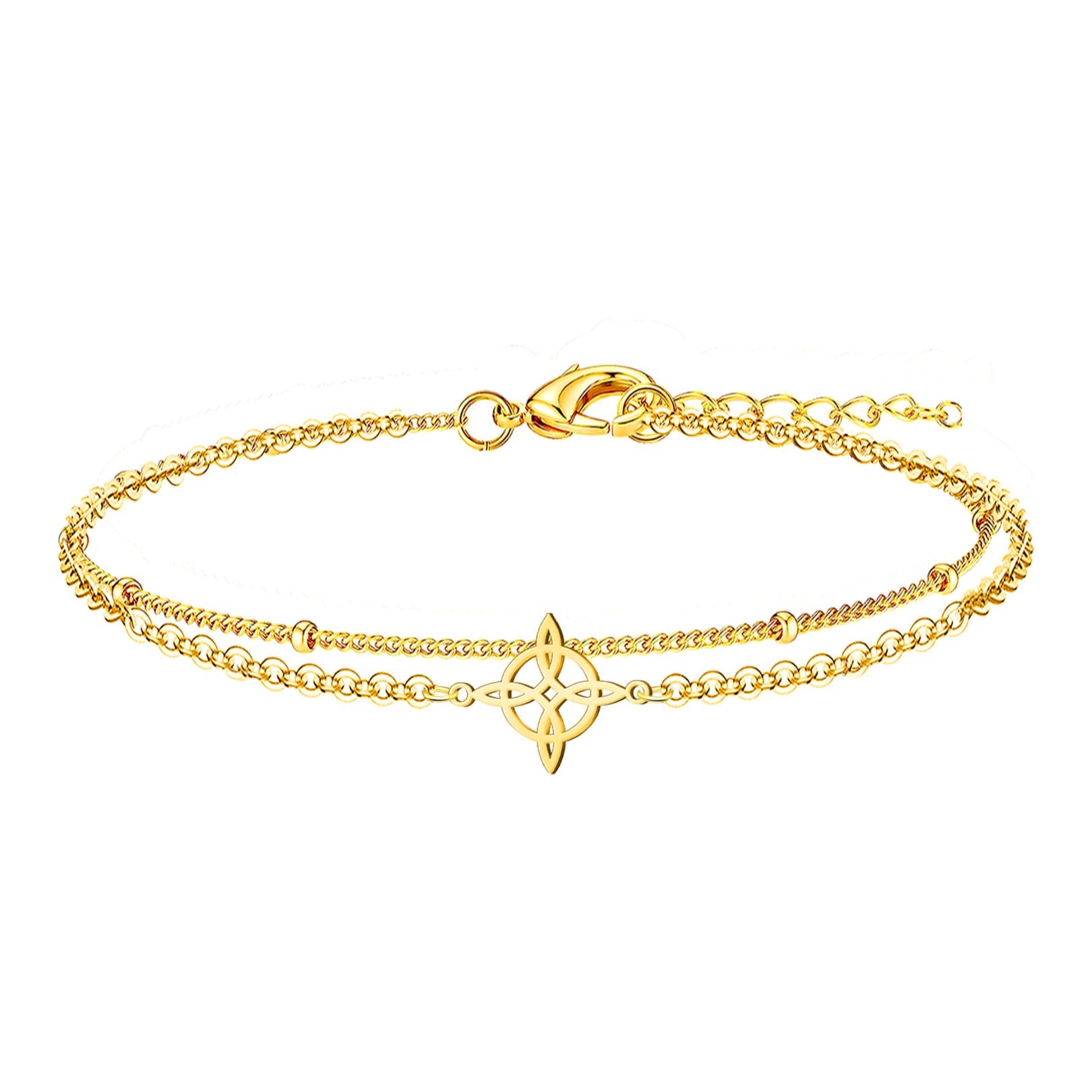 - PULSERA DE SUERTE CON DOBLE CADENA DE ACERO INOXIDABLE Y NUDO DE BRUJA DORADO: Este amuleto es de protección contra el mal de ojo, la envidia o los pensamientos dañinos. Ayuda a equilibrar las energías de su portador y fomenta la positividad. Atrae buena fortuna y armonía, es una pulsera de proteccion espiritual.