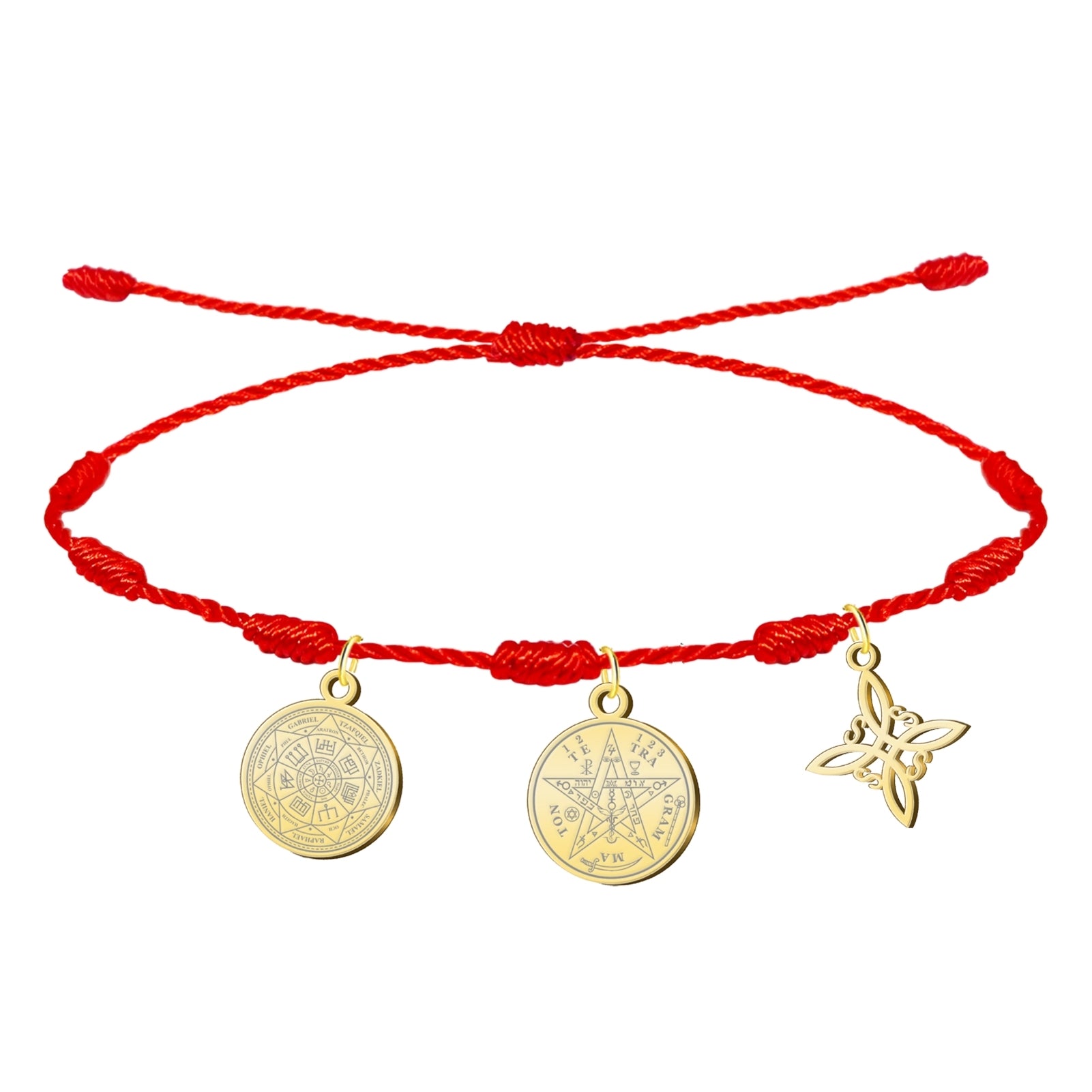 Esta pulsera une el Tetragrammaton, poderoso sello que aleja las energías negativas, con el Nudo de Bruja, símbolo ancestral de fuerza, equilibrio y buena suerte. El hilo rojo de 7 nudos actúa como escudo espiritual, bloqueando el mal de ojo y atrayendo fortuna. Fabricada en acero inoxidable color dorado, resistente al uso diario y al agua, es ideal para llevarla siempre contigo como amuleto personal.