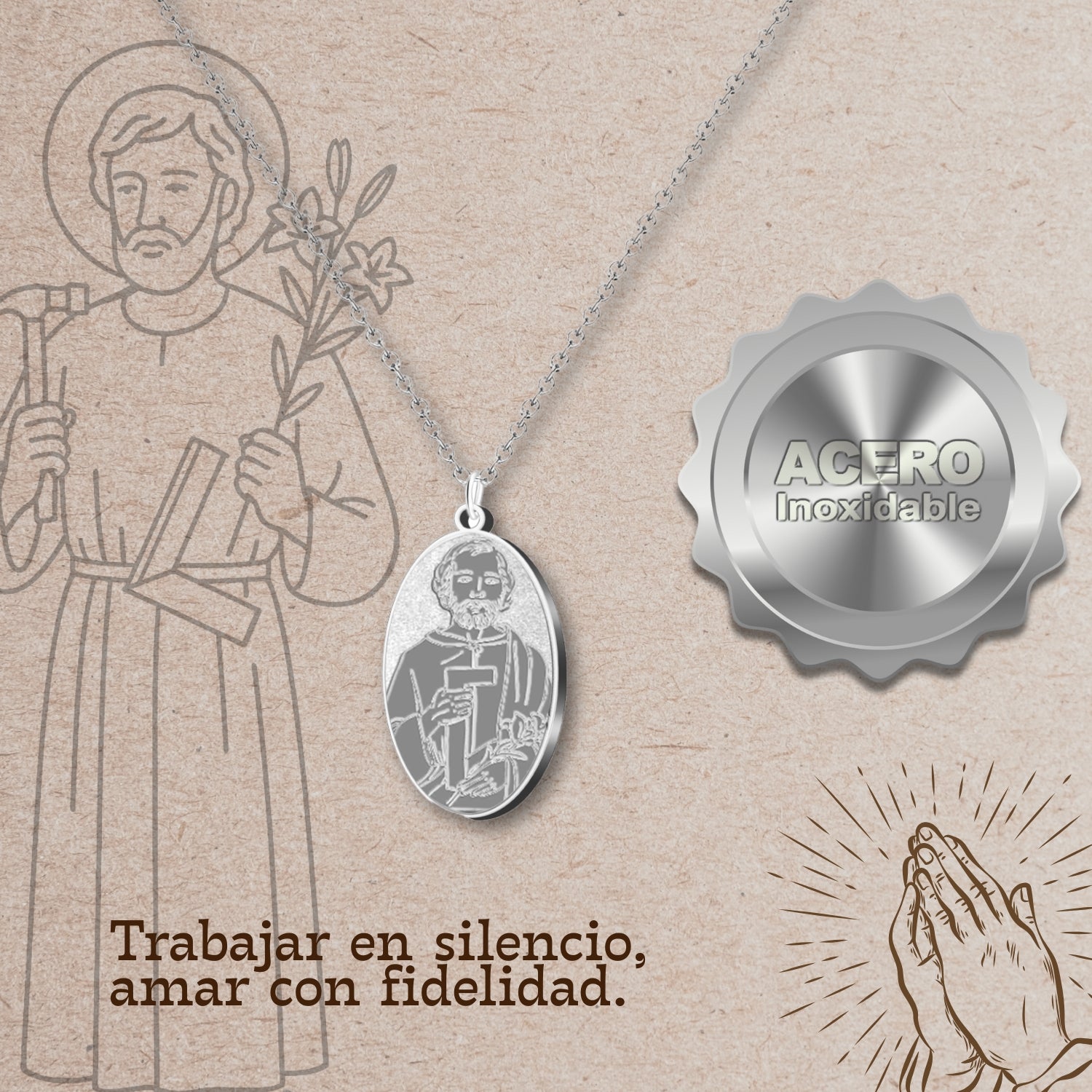 Lleva contigo una representación elegante de San José Obrero, patrón de los trabajadores y protector de la familia. Esta medalla captura la imagen del santo con sus atributos tradicionales: la escuadra de carpintero, que simboliza el trabajo digno, y el lirio, que representa la pureza y la santidad. Es más que una joya; es un recordatorio tangible de fe y una fuente de inspiración constante para el día a día.