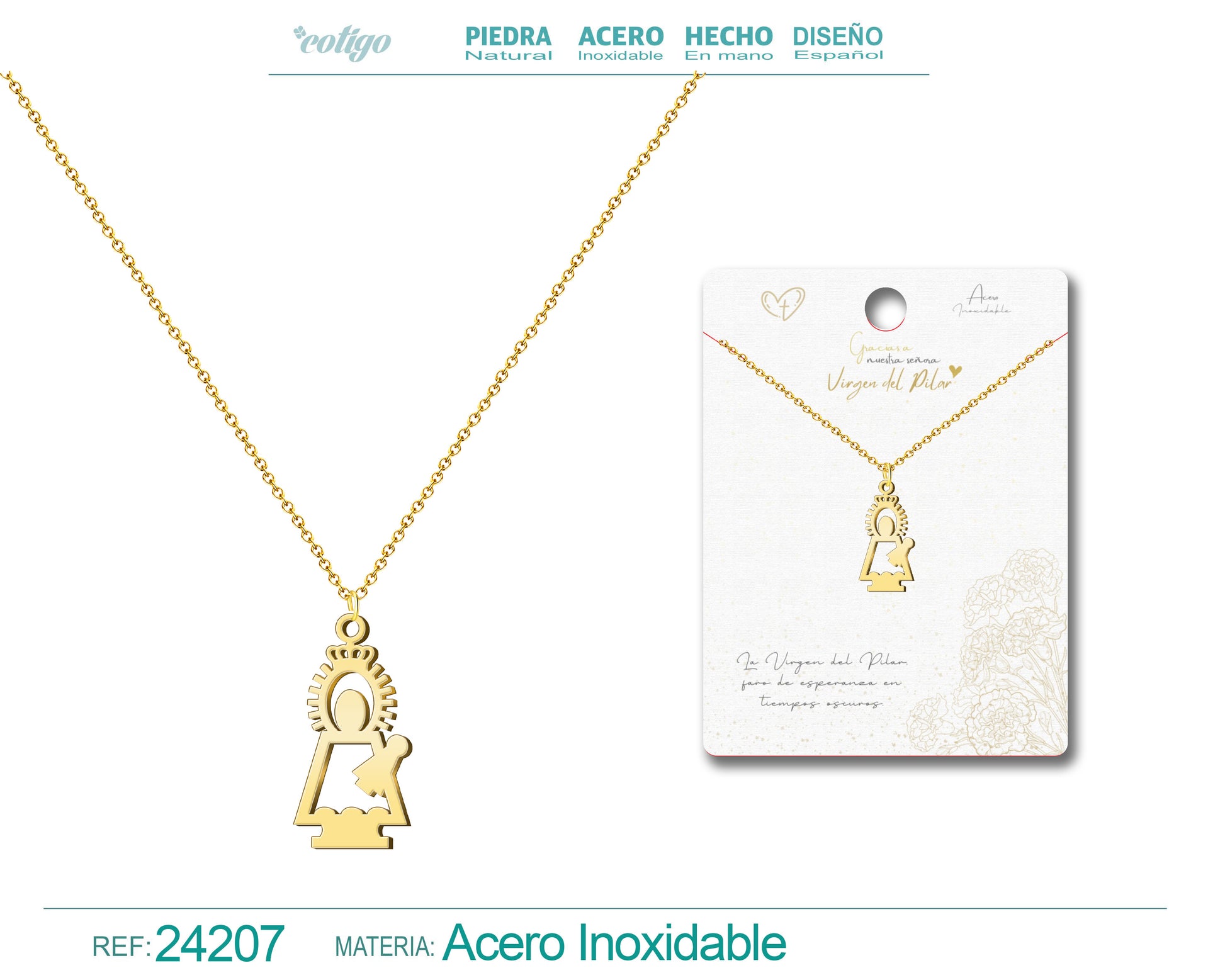 El colgante destaca por su delicada silueta calada, que perfila la icónica figura de la Virgen sobre el Pilar mediante trazos finos y precisos. Su acabado en acero dorado de alta calidad aporta un brillo cálido y duradero que realza cualquier tono de piel, acompañado de una cadena de eslabones clásicos muy favorecedora.