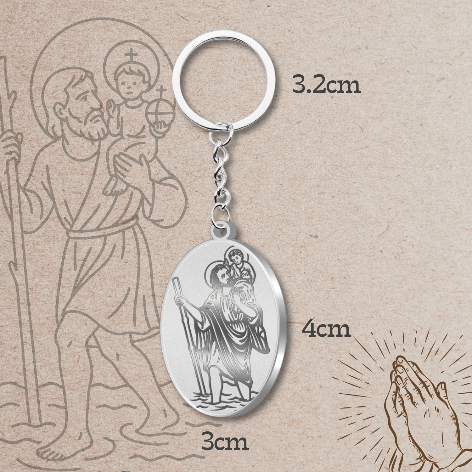 Fabricado en acero inoxidable de alta resistencia, este llavero está hecho para durar. Sabemos que las llaves sufren roces constantes en bolsillos y bolsos; por eso, hemos elegido un material que no se raya fácilmente, no se oxida y mantiene su brillo intacto año tras año. La medalla ovalada presenta un grabado preciso del Santo portando al Niño Jesús, una imagen clásica que inspira tranquilidad al volante.