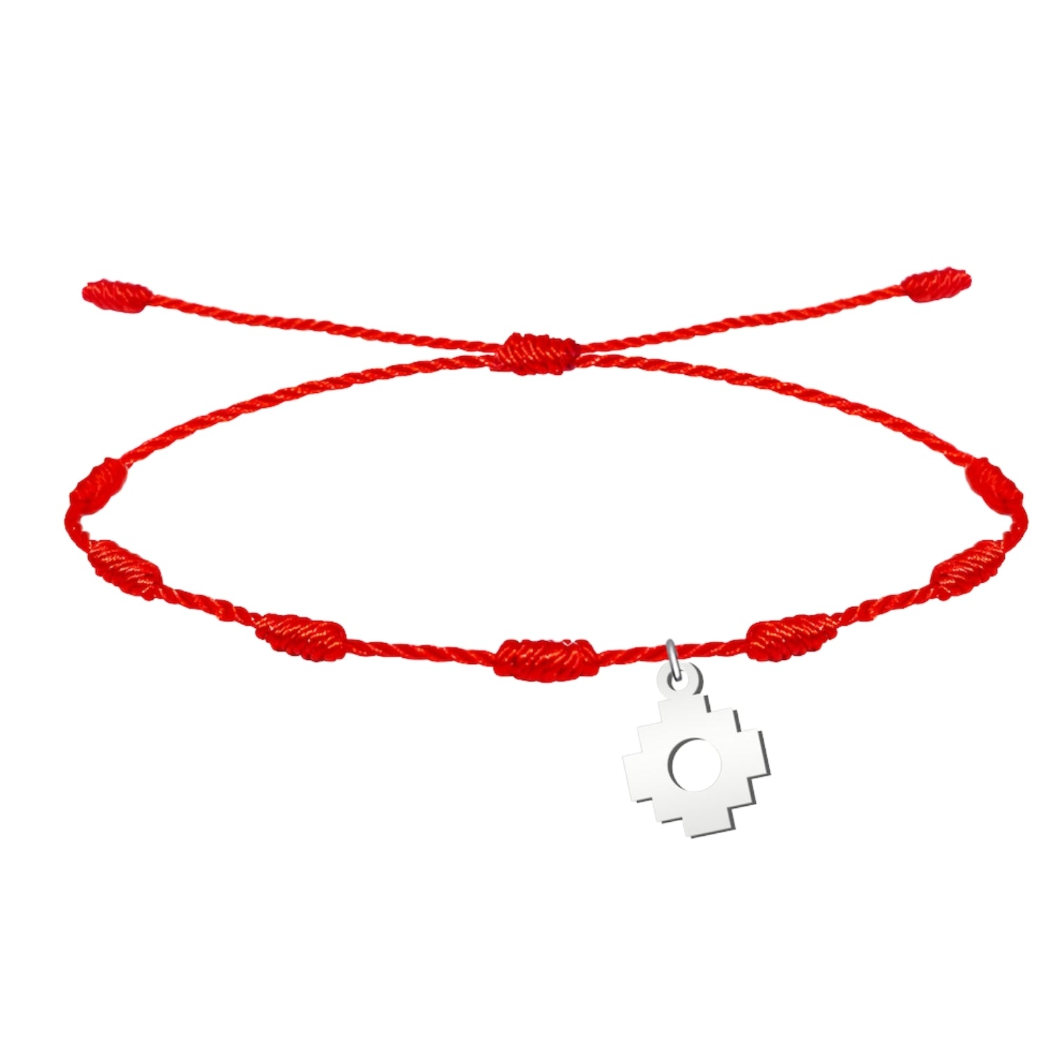 El elemento central es una Cruz Chacana en acero plateado, un símbolo que representa la conexión entre lo terrenal y lo divino. El acabado pulido del acero aporta un brillo sofisticado que contrasta perfectamente con el rojo intenso del cordón, garantizando una joya duradera y resistente al uso diario.
