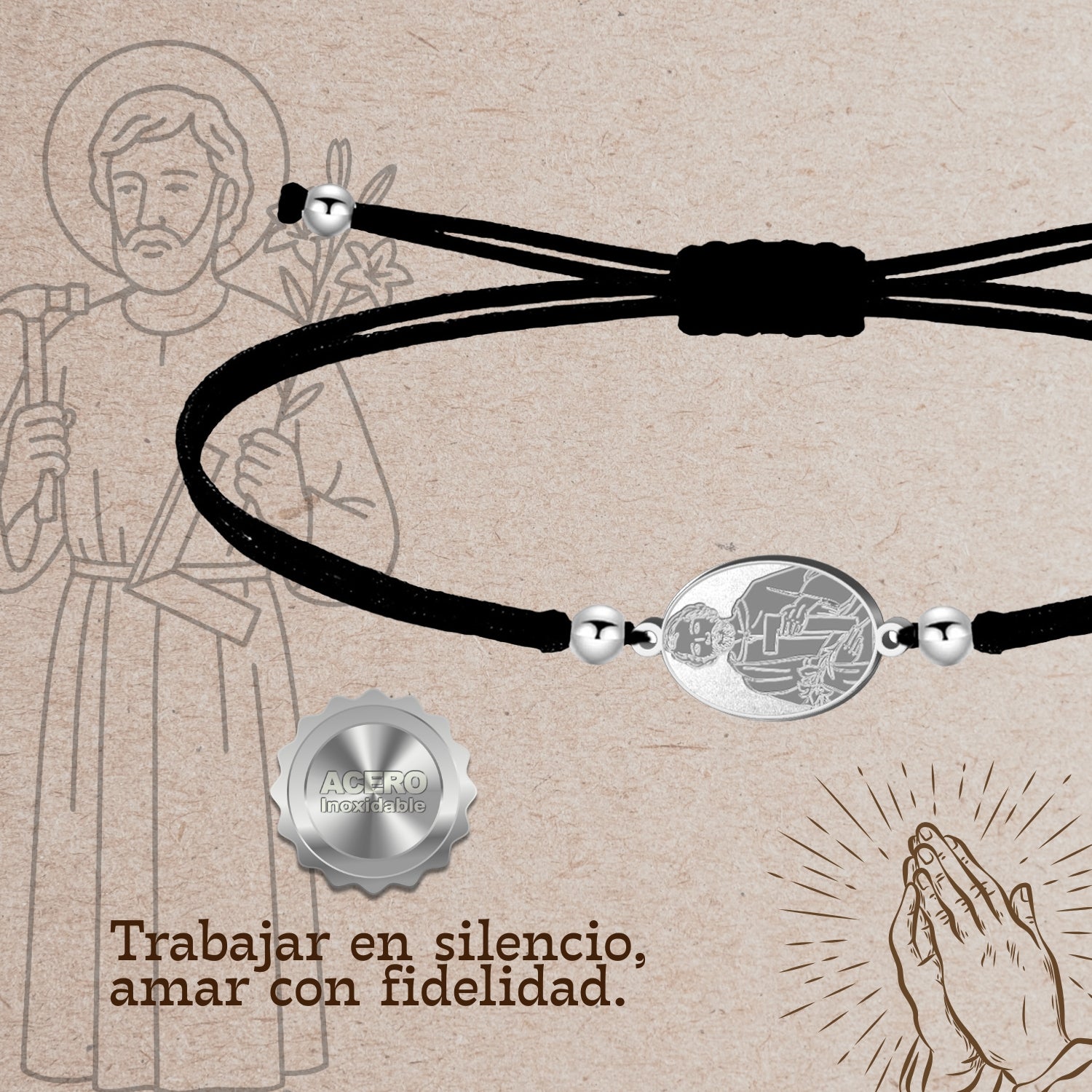 Esta pulsera minimalista está dedicada a San José Obrero, el santo que santificó el trabajo con sus propias manos. Diseñada para ser usada a diario, combina la resistencia del hilo encerado con la durabilidad eterna del acero inoxidable.