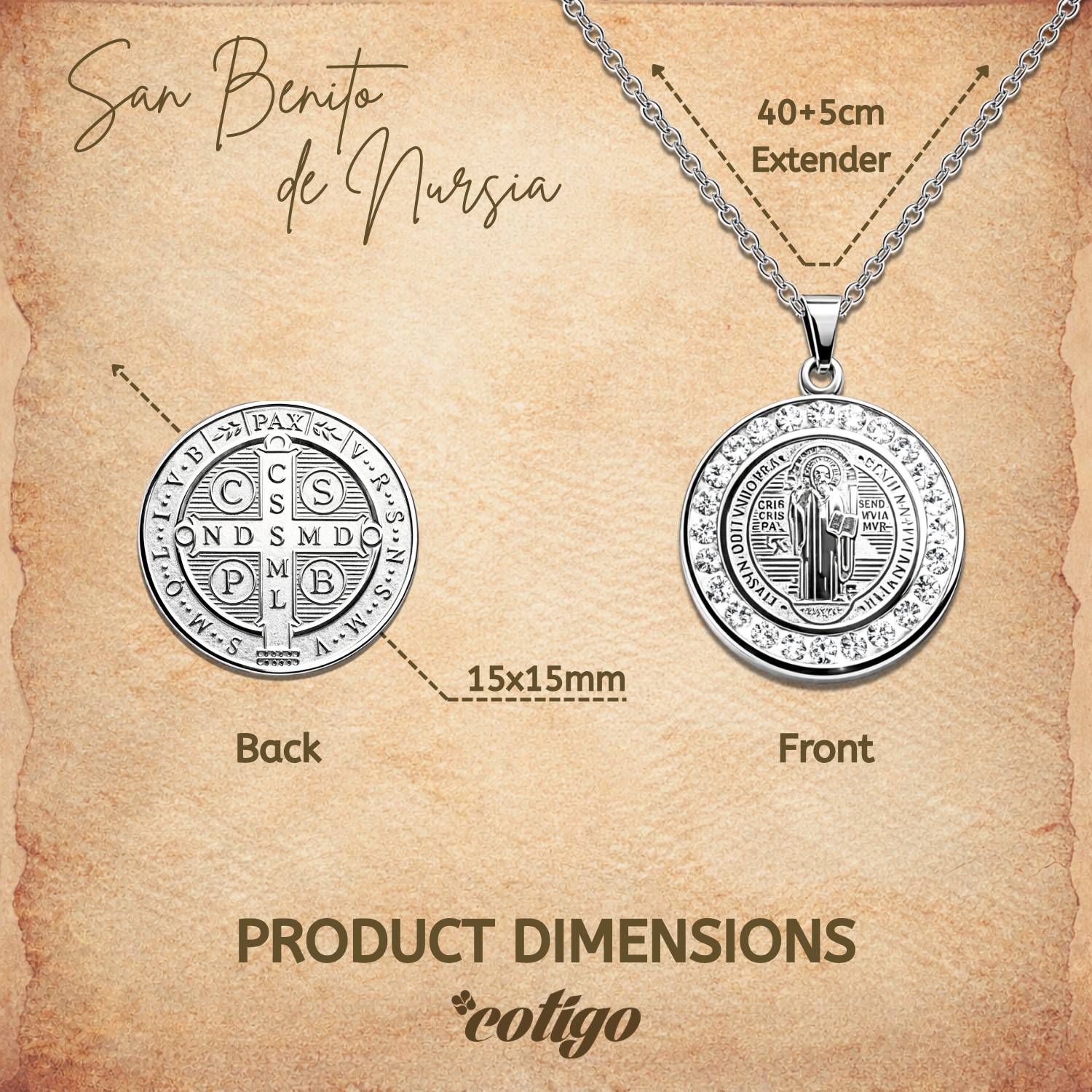 El diseño presenta un relieve detallado de San Benito en el centro, rodeado por un aro de circonitas que aporta brillo y realza la estética de esta medalla religiosa. Su acabado plateado crea un contraste elegante que la hace destacar visualmente.